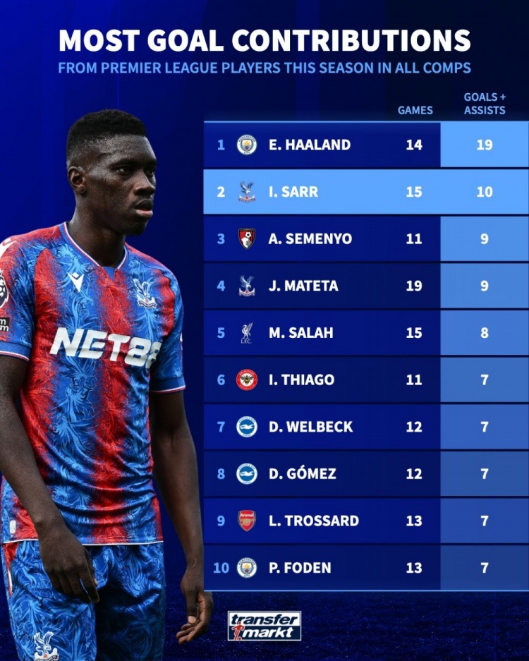 本赛季英超球员参与进球排名:哈兰德居首,萨尔排名次席