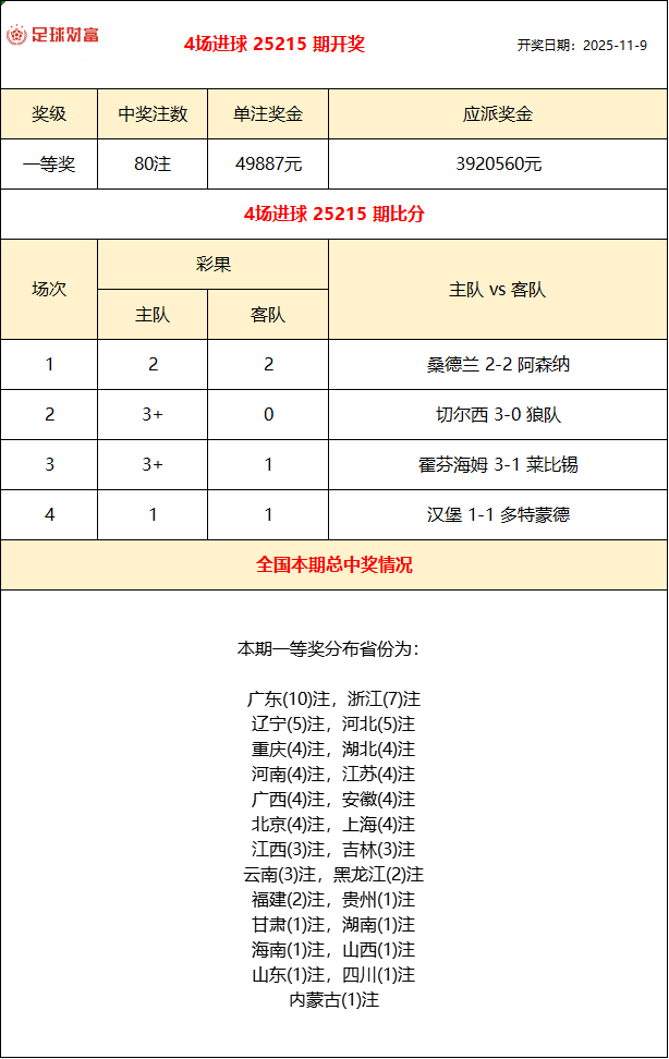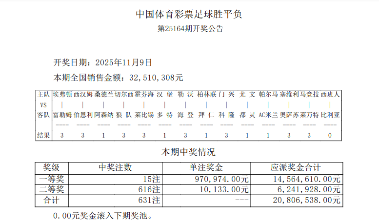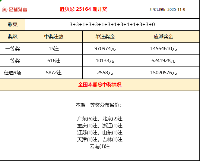 胜负彩25164期开奖:阿森纳遭绝平!头奖15注97万