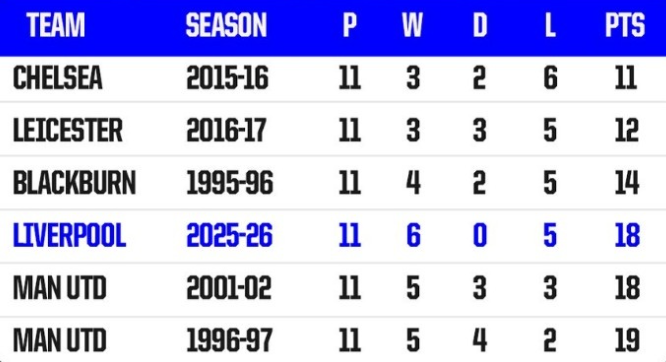 在上周末英超联赛焦点战中,利物浦客场0-3完败曼城,在前11轮联赛只拿到了18分,利物浦成为了英超历史同期积分第四少的卫冕冠军,而历史同期最低积分纪录是2015/16赛季的切尔西,蓝军在当时11轮只有11分。