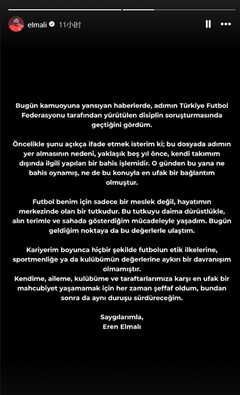 足球对我而言不仅是职业,更是我生命中的主要激情。我一直以诚信、汗水和在球场上的拼搏精神来践行这份热爱。如今我能取得的成就,正是基于这些价值观。在我的职业生涯中,从未有过任何违背足球伦理、体育精神或俱乐部价值的行为。无论过去还是未来,我将始终保持透明态度,绝不让自己、家人、俱乐部和球迷蒙受丝毫耻辱。”