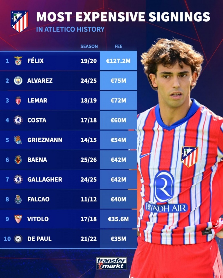 马竞队史最贵引援排名:菲利克斯居首,小蜘蛛位列次席