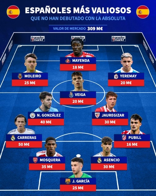近日,德国转会市场列出了,从未代表西班牙国家队有过首发的身价最高11人阵容,阵容中有巴萨一门霍安-加西亚,阿森纳潜力中卫莫斯克拉,皇马主力左后卫卡雷拉斯。