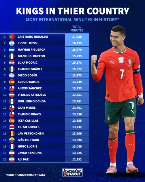 德国转会市场列出了国家队出场时间排名,C罗居首,梅西次席。洪都拉斯球员梅诺尔·菲格罗亚排名第三,意大利传奇门将布冯则位列第四。