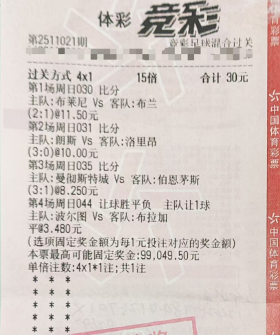 近日,来自陕西安康的彩民晒出了自己竞彩4串1混合倍投,选择挪超、法甲、英超比分,葡超让球,最终全部命中,获得税前9.9万奖金,下面咱们欣赏一下实单!挪超:布莱尼2-1布兰,SP值11.50法甲:朗斯3-0洛里昂,SP值10.00英超:曼城3-1伯恩茅斯,SP值8.250葡超:波尔图2-1布拉加,SP值3.48