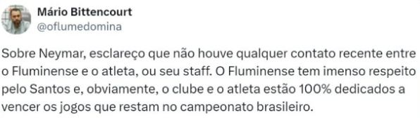 比滕考特表示:“关于内马尔,我澄清弗鲁米嫩塞与这名球员或者球员团队,在近期没有任何接触,弗鲁米嫩塞对桑托斯俱乐部保持极大的尊重,而且桑托斯与内马尔本人显然正100%专注于赢得巴甲联赛剩余的比赛。”