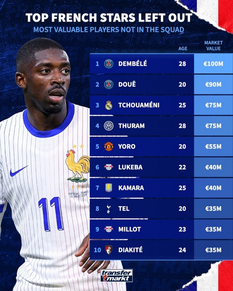 德国转会市场统计了无缘本期法国队名单球员的身价,并列出榜单,登贝莱1亿欧居首。