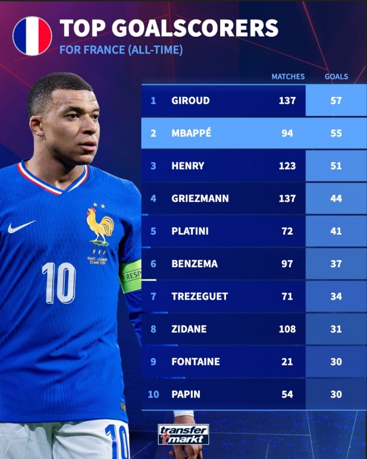 法国队史射手榜:吉鲁57球居首,姆巴佩位列次席