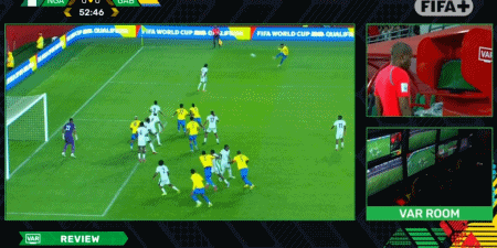 第52分钟,阿平丹戈耶禁区内被尼日利亚球员拉倒,但主裁判经过VAR回看后未判罚点球!