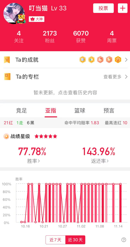 叮当猫 目前10连红状态很火热,亚指近14中13,他的推荐全是免费发布的,值得一看。