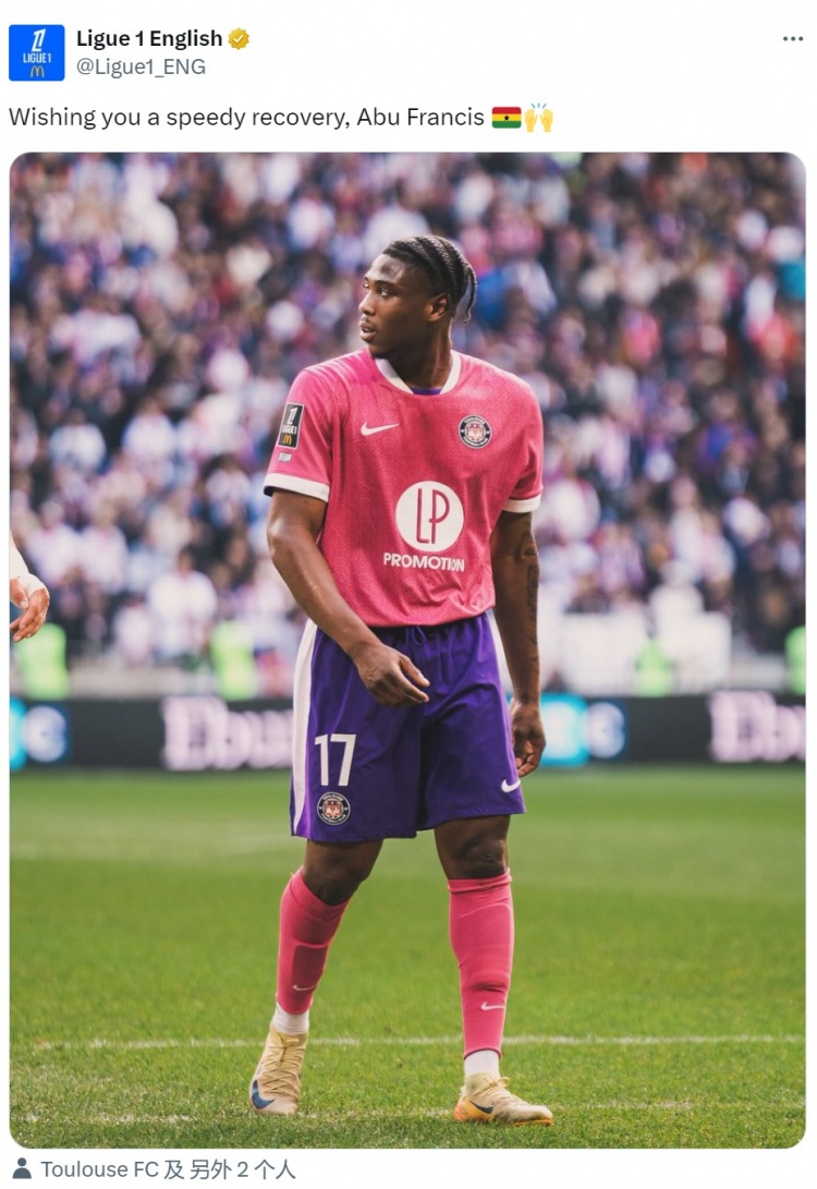 法甲官方社媒发文,晒出这位加纳中场的照片并配文:“祝你早日康复”,表达了对这位法甲球员的慰问与支持。