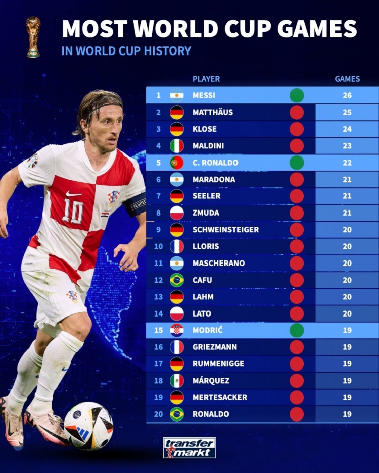 世界杯历史出场次数排名:梅西居首,莫德里奇在列