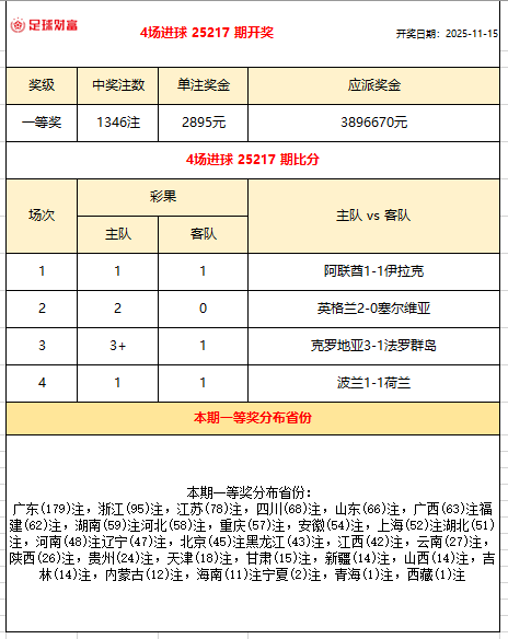 4场进球25217期开奖:波兰1-1荷兰,头奖达1346注