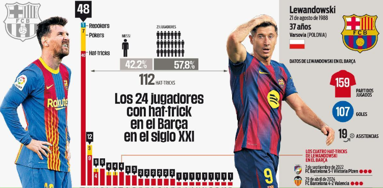本赛季西甲第12轮,莱万上演帽子戏法,帮助巴萨客场4-2大胜塞尔塔,这是37岁的莱万第4次代表巴萨上演帽子戏法,追平了内马尔和埃托奥的纪录。据西媒统计,21世纪巴萨戴帽球员中,梅西48次戴帽排名第一,苏亚雷斯12次排名第2,克鲁伊维特和里瓦尔多分别5次戴帽。