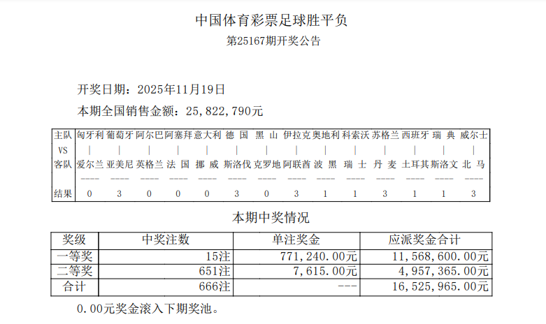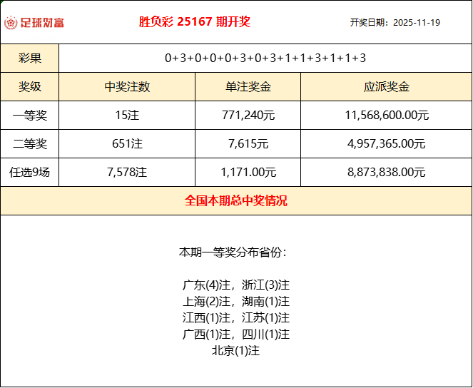 胜负彩25167期开奖:神剧情频出!头奖15注77万