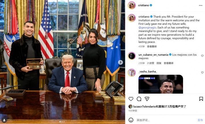 C罗在社交媒体上发文致谢:“感谢总统先生的邀请,以及您和第一夫人对我及未婚妻乔治娜的热情欢迎。我们每个人都可以做出非凡贡献,我已准备好履行我的职责,激励新一代共同建设一个以勇气、责任与持久和平为定义的未来。”