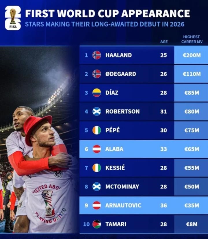 2026年世界杯首次参赛球员历史最高身价榜: