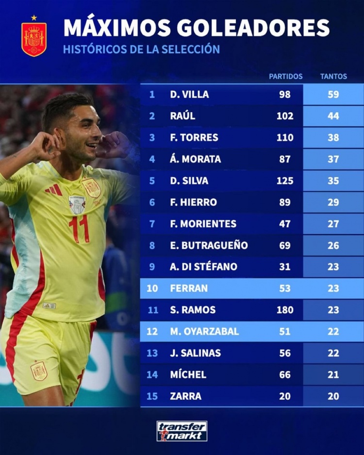 德国转会市场列出西班牙队史射手榜,其中比利亚59球居首,费兰-托雷斯23球第10位,现役球员中莫拉塔位列最高,奥亚萨瓦尔打进22球。