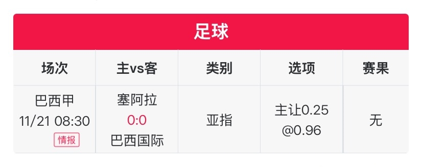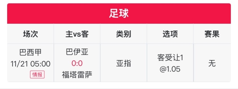 今日用户天机不泄露 进行了公推,他的状态目前也是十分火热,近期总体战绩15红13,专栏更是4连红。今日天机不泄露免费公推了巴甲比赛,巴伊亚主场对阵福塔雷萨和塞阿拉对阵巴西国际。需要了解的小伙伴可以点击用户天机不泄露最新帖子即可找到。
