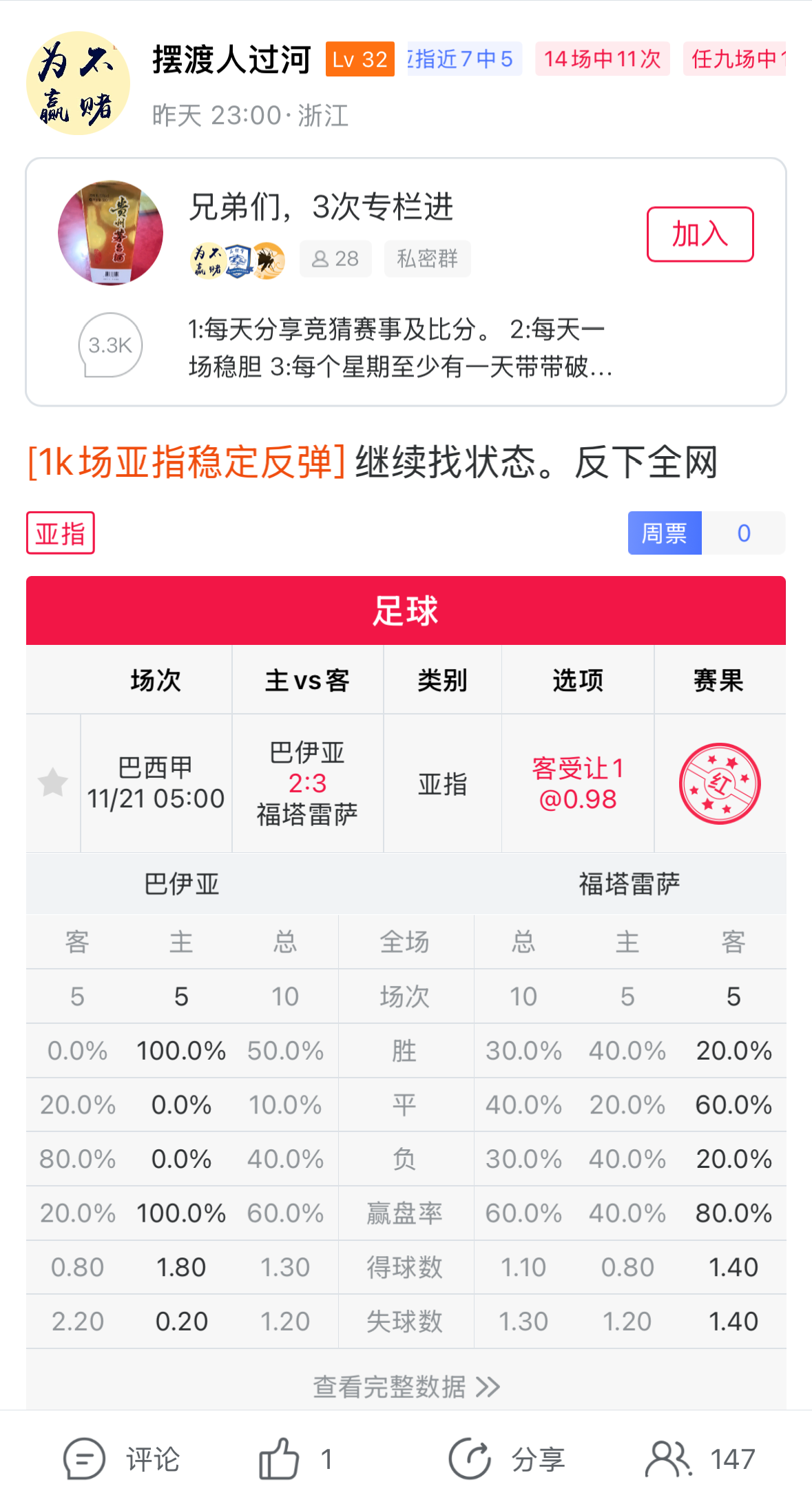 昨晚巴伊亚主场对阵福塔雷萨的巴甲联赛,当全网一致看好主队时,用户摆渡人过河 凭借独到眼光,精准命中福塔雷萨客场3-2击败巴伊亚!
