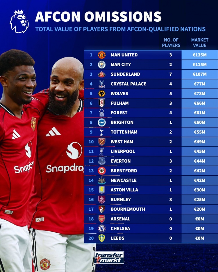 德国转会市场统计了英超各队将参加非洲杯球员的身价,并列出相关参赛球员身价总和排名。
