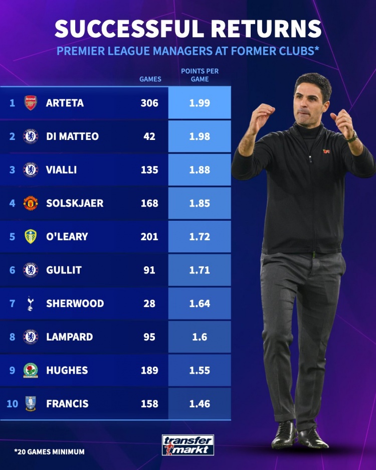 德国转会市场统计了教练执教球员时代英超老东家的场均积分,并列出榜单,球员时期曾在阿森纳效力的阿尔特塔1.99分居首,前切尔西主帅迪马特奥1.98分排名第二。