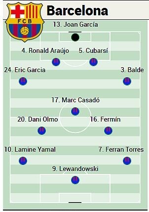 北京时间11月22日晚23:15,西甲第13轮的比赛继续进行,巴萨回归诺坎普球场主场对阵毕尔巴鄂竞技。赛前,《阿斯报》预测了巴萨本场的首发阵容,亚马尔、费兰、莱万组成三箭头,奥尔莫出现在中场,佩德里因伤无法出战,德容停赛。