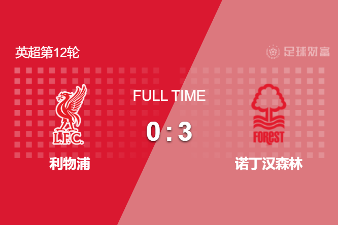 最终全场比赛结束,利物浦主场0-3爆冷不敌诺丁汉森林,遭遇近7轮6负,跌至积分榜第11位。
