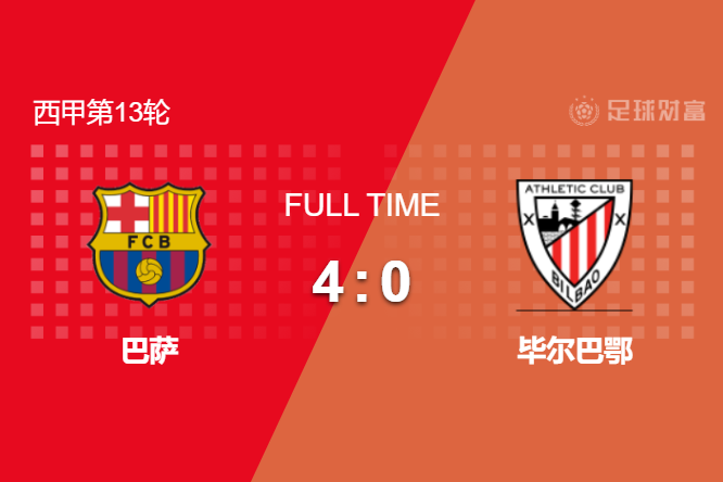 最终全场比赛结束,巴萨主场4-0大胜毕尔巴鄂竞技。