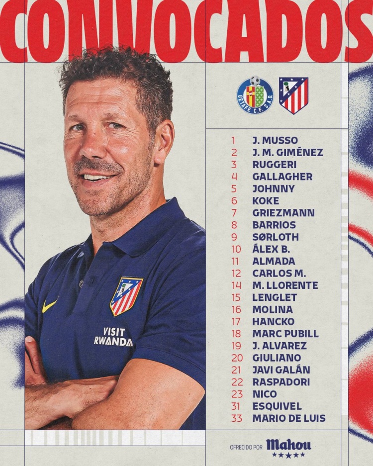 北京时间11月24日凌晨1点30分,西甲联赛第13轮,马竞将在客场挑战赫塔菲,赛前马竞公布本场比赛大名单。