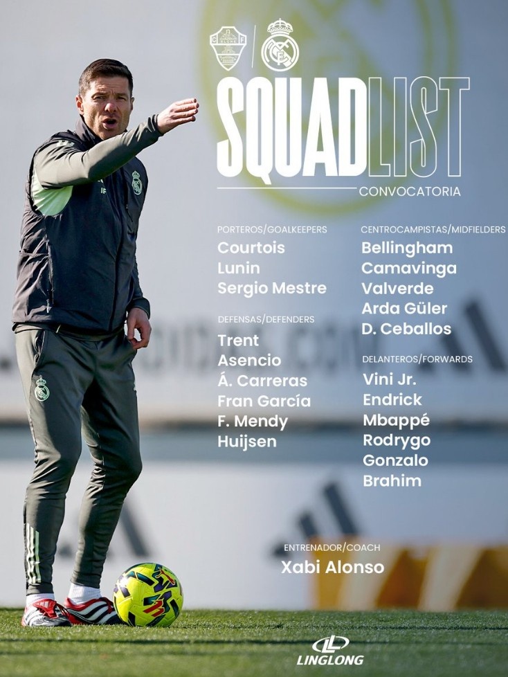 北京时间11月24日凌晨4点,皇马将在西甲联赛第13轮客场挑战埃尔切,赛前皇马公布出征客场大名单。