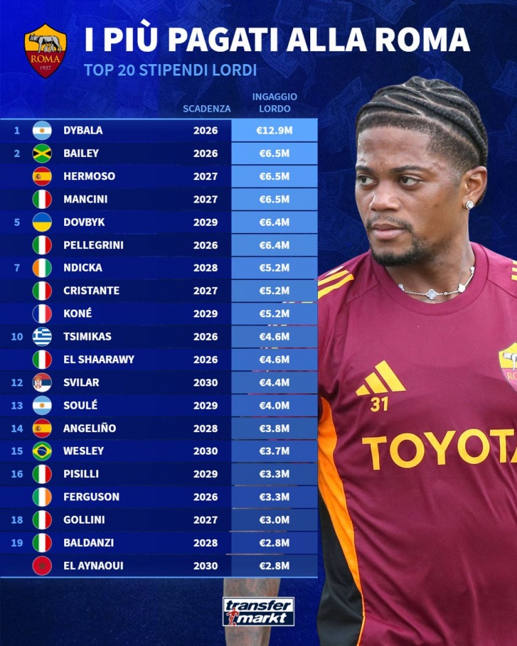 德国转会市场列举了罗马队内的薪资排名,其中意大利前锋迪巴拉薪资排名第一,利昂·贝利排名罗马薪资榜第二。