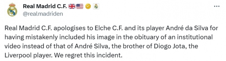 随后皇马官方迅速道歉,承认错误的将埃尔切前锋安德烈-席尔瓦放入了视频中,向埃尔切俱乐部和安德烈-席尔瓦本人道歉。