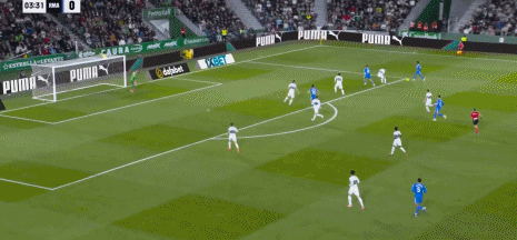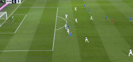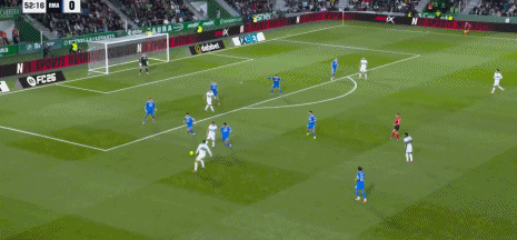 第53分钟,皇马落后!巴莱拉禁区内背身脚后跟做球,费瓦斯单刀球低射破网,1-0!