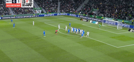 第87分钟,皇马立即绝平!左侧任意球开入禁区,贝林厄姆凌空抽射被扑出,姆巴佩极限回做,助攻贝林打空门得手,2-2!!!