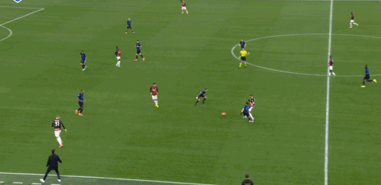 第4分钟,迪马尔科左路传中,小图拉姆后点头球攻门被迈尼昂飞身扑出!