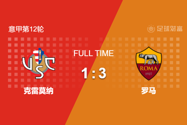 最终全场比赛结束,罗马客场3-1击败克雷莫内塞,登顶意甲积分榜。