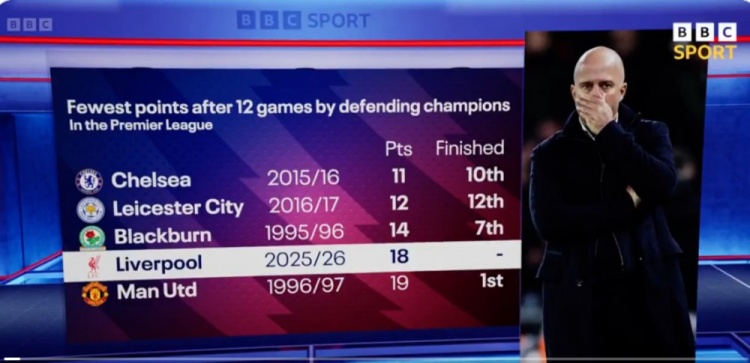 据统计,利物浦本赛季英超前12轮仅拿到18分,成为英超历史同期积分第四少的卫冕冠军。