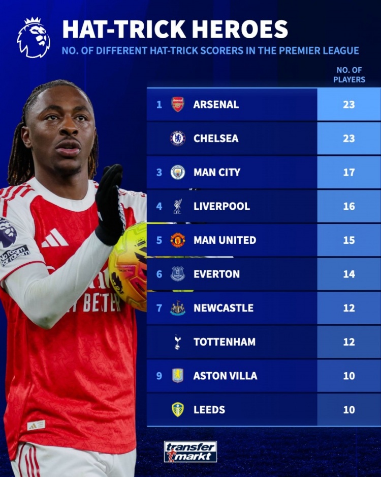 英超历史戴帽球员数量排名:阿森纳&切尔西23人并列第一