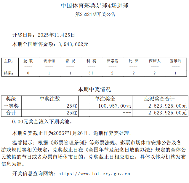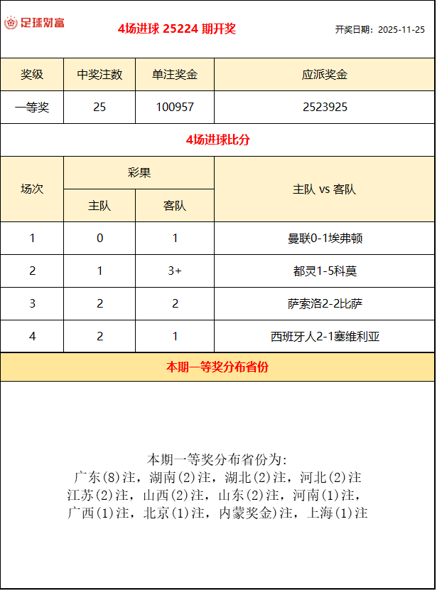 4场进球25224期开奖:科莫5-1大胜,头奖25注10万元