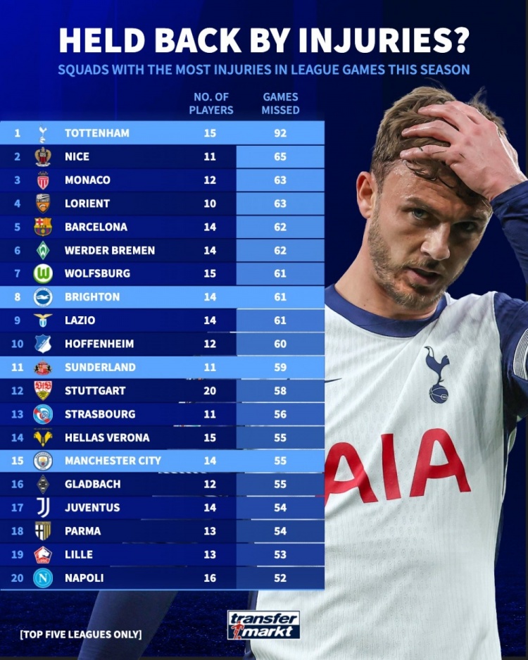 本赛季五大联赛多支球队遭受了伤病侵袭,德国转会市场网站统计本赛季各支球队球员累计缺阵场次次数排名,其中热刺15人共累计伤停了92场比赛排名第一。