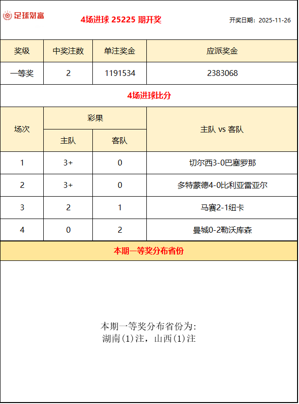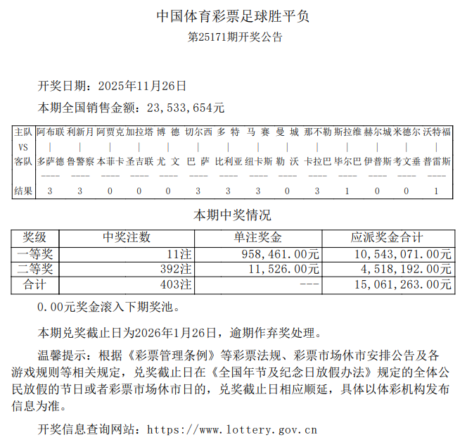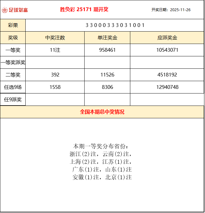 胜负彩25171期开奖:曼城主场翻车,头奖95.8万