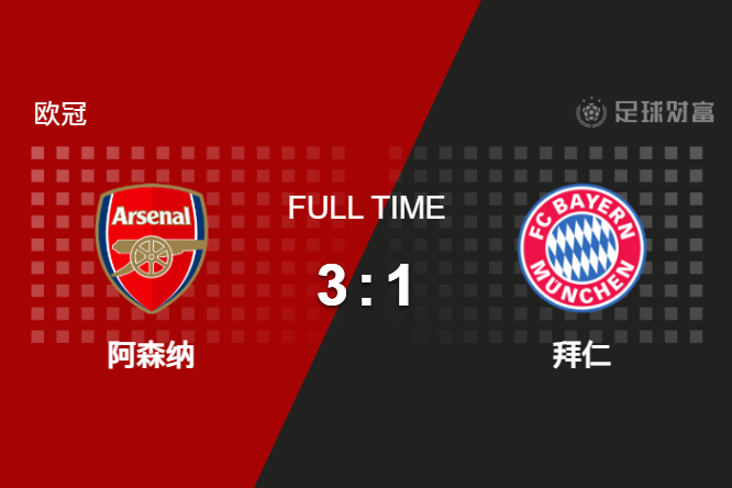 最终全场比赛结束,阿森纳主场3-1战胜拜仁。
