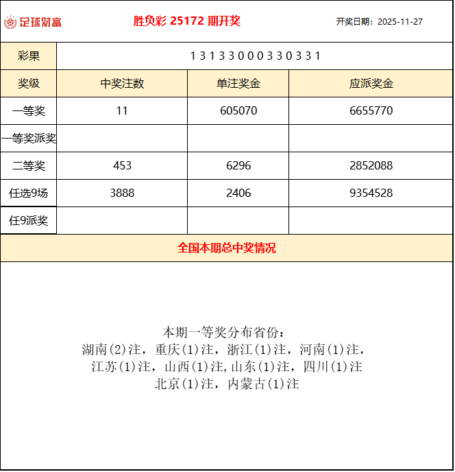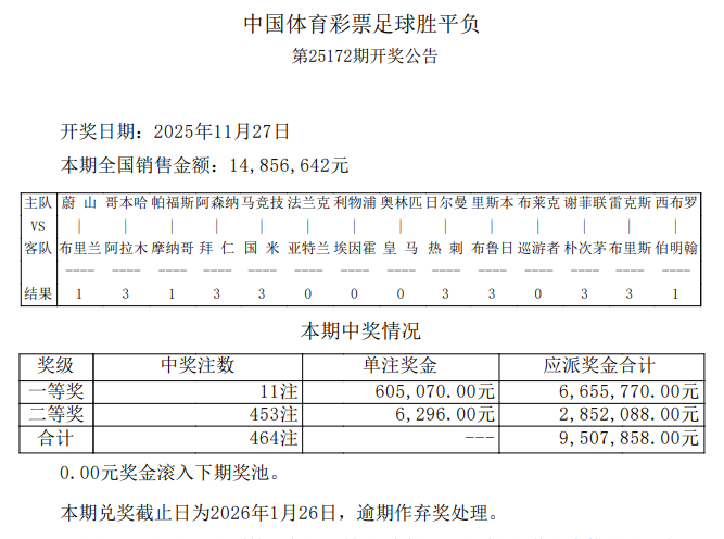 胜负彩25172期开奖:利物浦主场惨败,头奖60.5万
