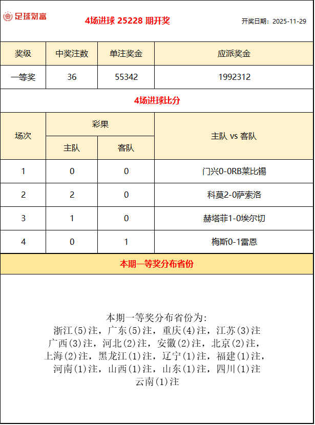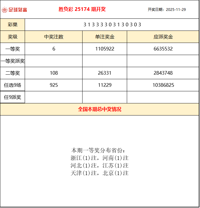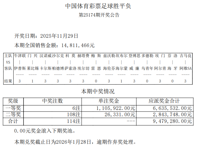 胜负彩25174期开奖:伊镇客场失利,一等奖110万