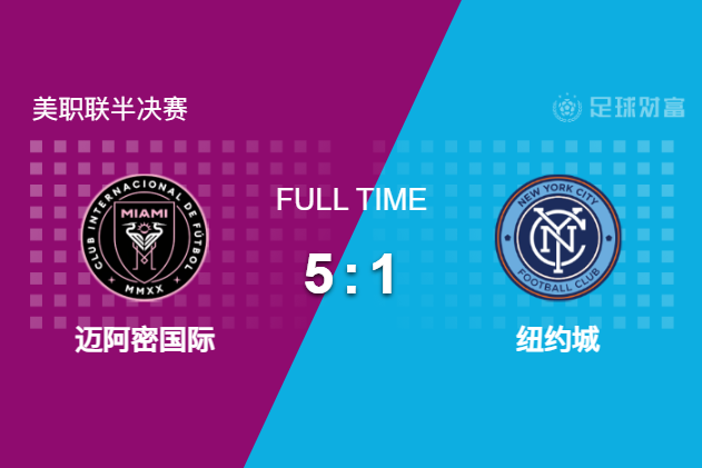 最终全场比赛结束,迈阿密国际主场5-1大胜纽约城,决赛对手将是圣地亚哥vs温哥华白浪之间的胜者。