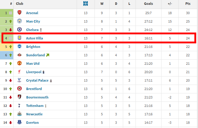 如今英超13轮战罢,维拉已经来到了积分榜第4名,重新成为了前四名有力竞争者。