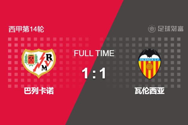 最终全场比赛结束,瓦伦西亚客场1-1战平巴列卡诺。