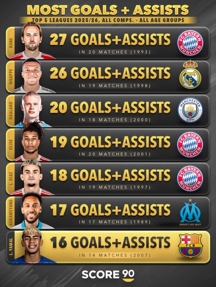 近日,外媒Score90统计了本赛季五大联赛球员参与进球数榜单,凯恩20场比赛24球3助攻,参与27球排名首位,姆巴佩19场23球3助攻,参与26球排名第2位,哈兰德参与20球排名第三位。拜仁锋线三人组同时上榜,迪亚斯参与18球,奥利塞参与19球,老将奥巴梅扬参与17球,亚马尔参与16球。