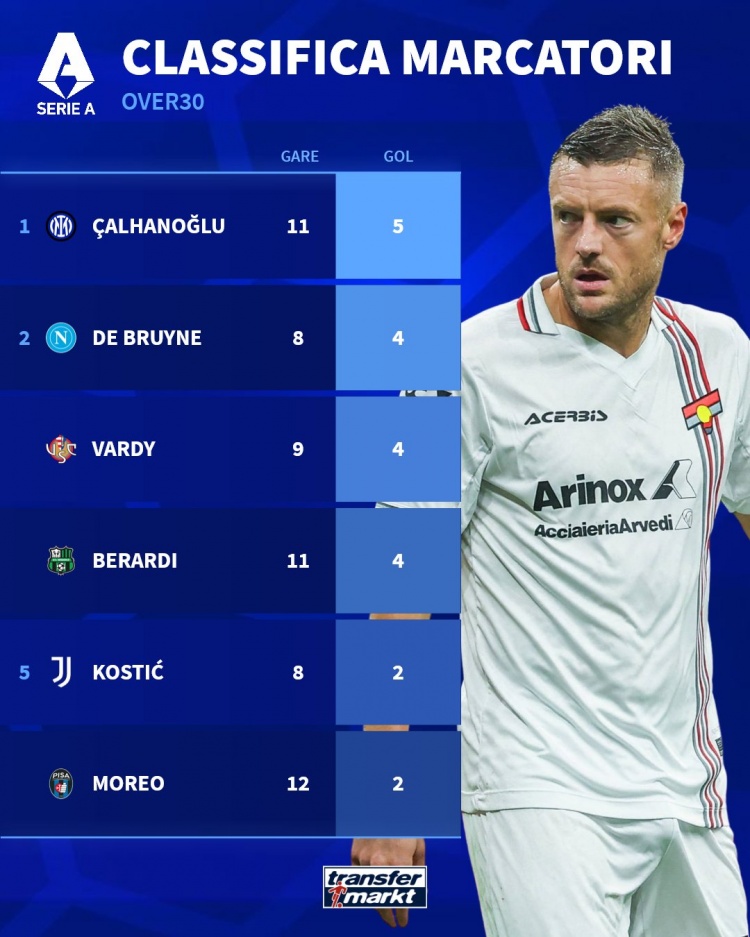 德国转会市场统计了本赛季年龄30+球员在意甲的进球数量,并列出榜单。其中国际米兰中场恰尔汗奥卢5球居首,而德布劳内、瓦尔迪、贝拉尔迪全部都打入了4球。本赛季意甲年龄30+球员射手榜如下:1恰尔汗奥卢——11场5球2德布劳内——8场4球3瓦尔迪——9场4球4贝拉尔迪——11场4球5科斯蒂奇——8场2球6莫雷奥——12场2球