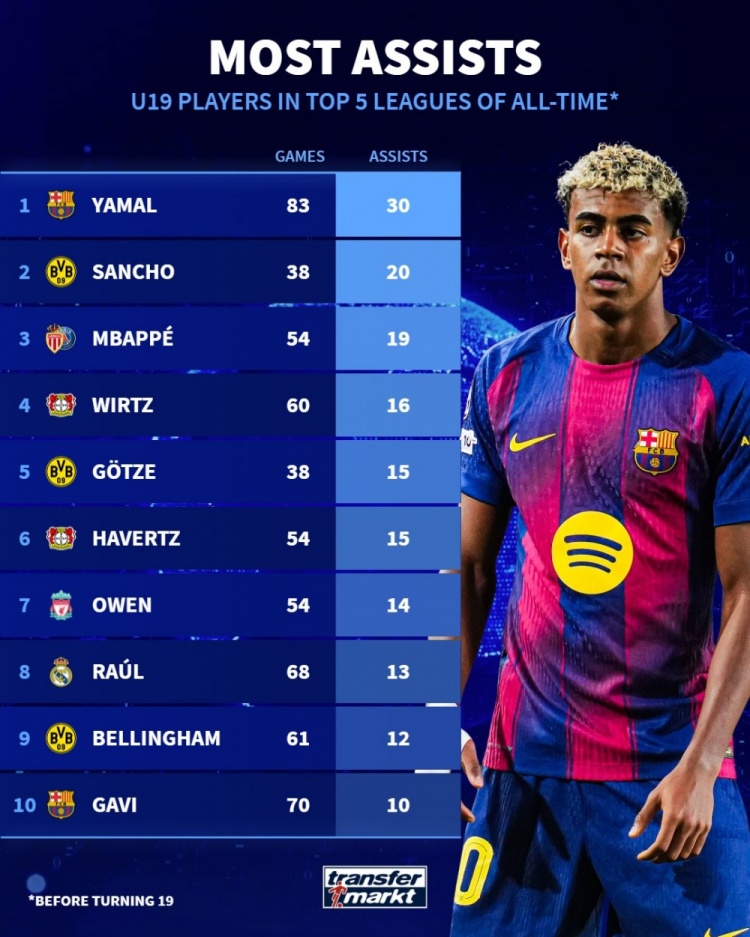 德国转会市场统计了U19球员在五大联赛中的助攻次数,并列出榜单,巴萨球星亚马尔30助居首,曾经的天才新星桑乔以20助次席。